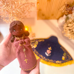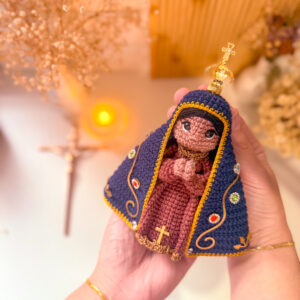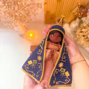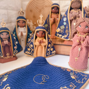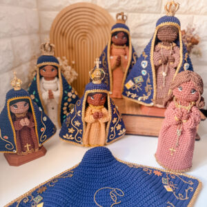 O eBook traz 3 modelos de Nossa Senhora Aparecida em amigurumi, cada um com características únicas, pensados para diferentes estilos de encomenda, presentes ou coleções: